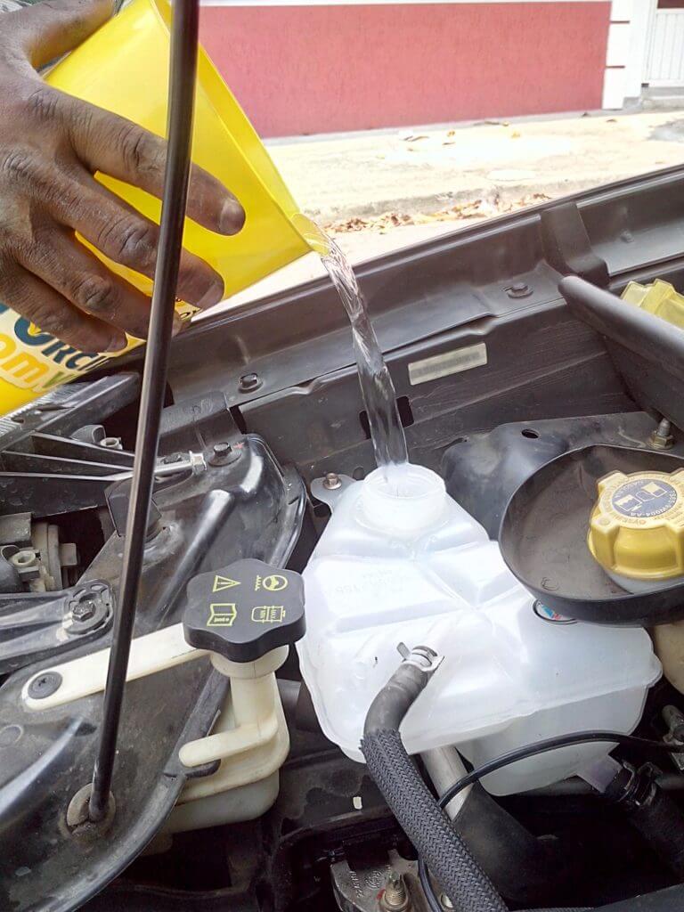 Não se usa água pura no radiador. Hoje, é necessário uma mistura que varia de acordo com o fabricante, mas, em geral formada por 50% de água pura (ou destilada ou desmineralizada) e 50% do aditivo etilenoglicol. Por isso falamos “líquido de arrefecimento”. E qual a finalidade desse aditivo? São duas: limpar o sistema de refrigeração, evitando a oxidação e os depósitos de sujeiras e, também, elevar o ponto de ebulição da água com o propósito de dificultar dela ferver, no caso de subir muito sua temperatura. Lojas de autopeças já vendem essa mistura na proporção correta.